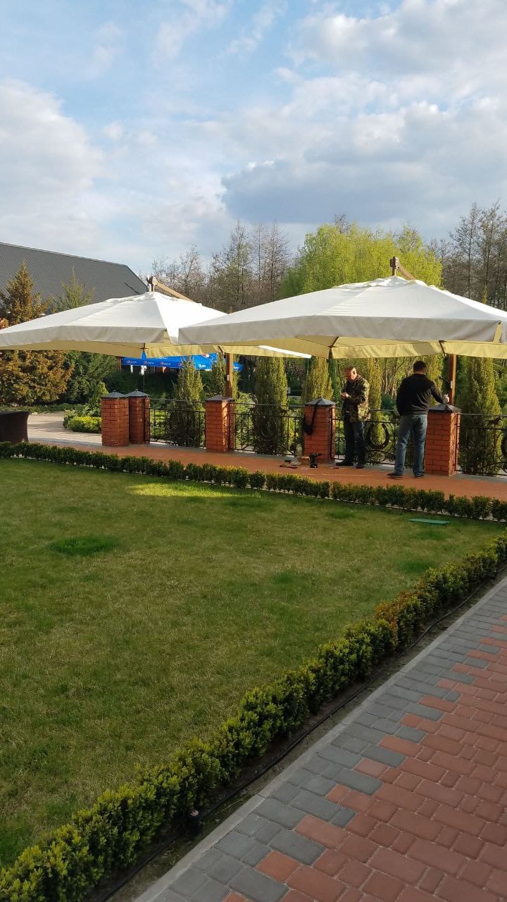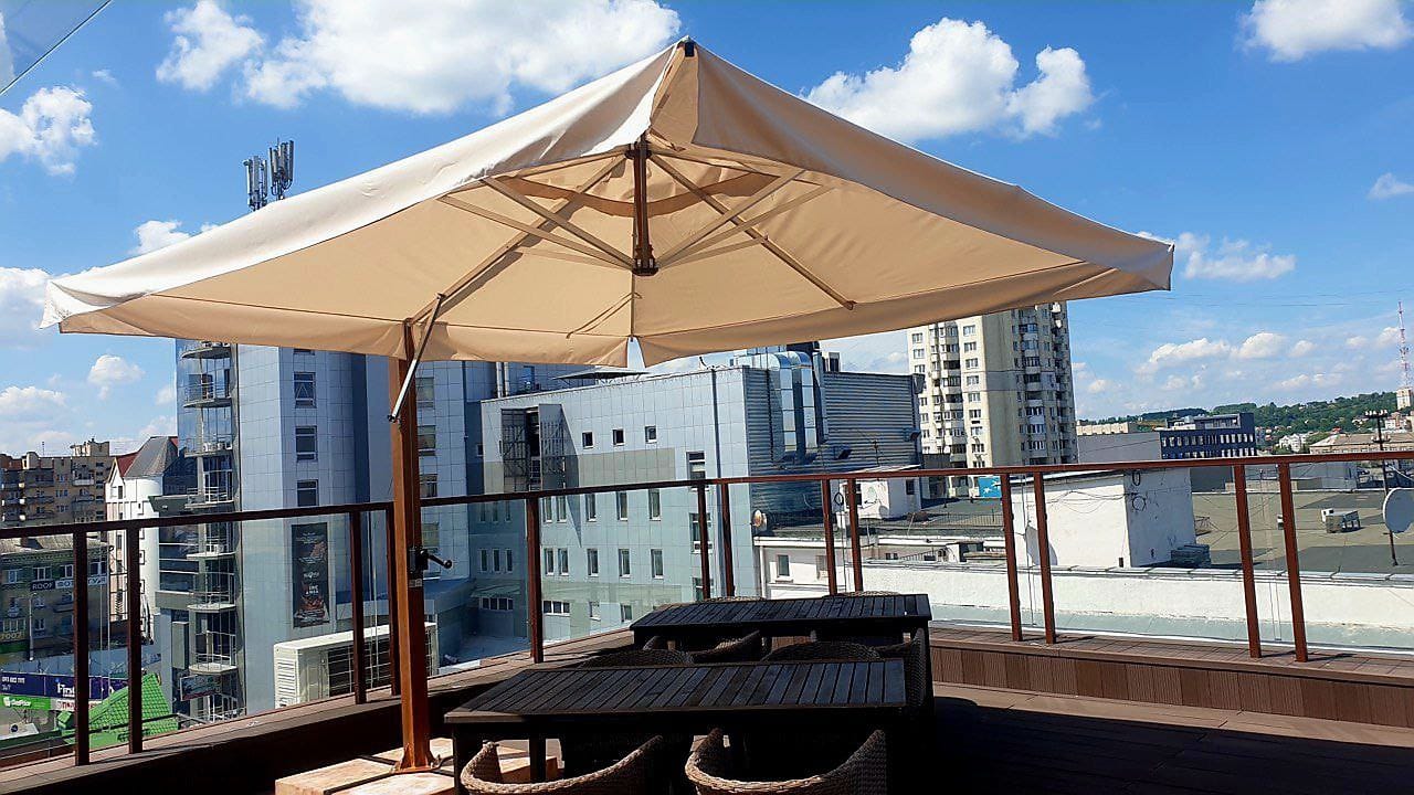 Консольна парасоля «Рим» займає одну з провідних позицій у нашій лінійці та є однією з найпопулярніших моделей — для тераси, кафе та готелю.