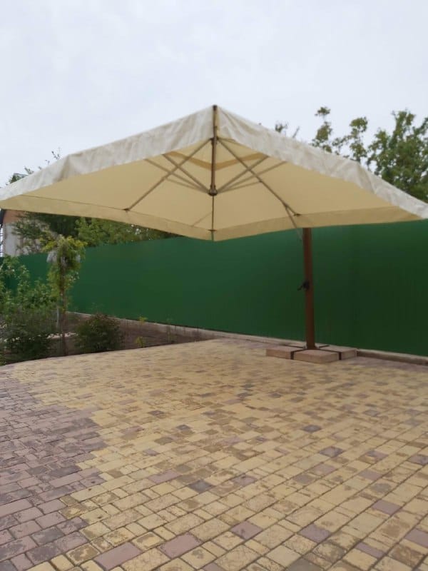 Вулична консольна парасоля «Рим» (4 × 4 м) — практичне рішення для невеликих терас, кафе або приватних зон відпочинку. Квадратний купол створює рівномірну тінь на площі 16 м², а бічна опора не заважає розміщенню столу та гостей.